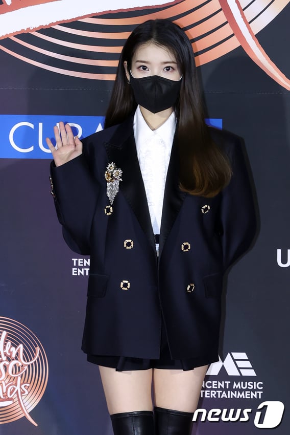 패션엔 아이유 골든 디스크 음원 대상 요정 미모 빛낸 블랙 화이트룩